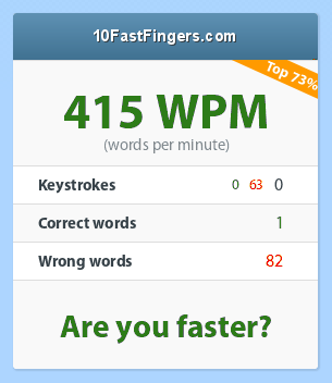 Ospite Inviato Luglio 20, 2013 Risultato Screenshot Parole al minuto (WPM) 81 Tasti premuti 415(405 | 10) Parole corrette 63 Parole sbagliate 1 You are better than 82.74% of all users (position 73 of 423 - last 24 hours) Condividi questo messaggio Link di questo messaggio Condividi su altri siti