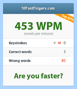 xXx_b0ngl0rd420_xXx 380 Inviato Luglio 20, 2013 http://10fastfingers.com/speedtests/generate_screenshot_result/87_453_0_0_68_3_85.16_65_438 Okay, frequenterò un corso di scrittura a 10 dita. Il 20/09/2013 rifarò il test. Condividi questo messaggio Link di questo messaggio Condividi su altri siti